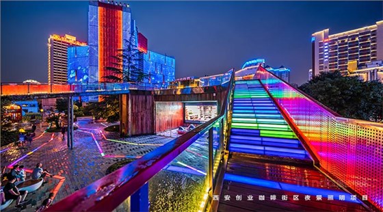 信達電通在2017年完成了眾多大型城市亮化項目,其中濃墨重彩的一筆當屬西安創業咖啡街區的亮化。