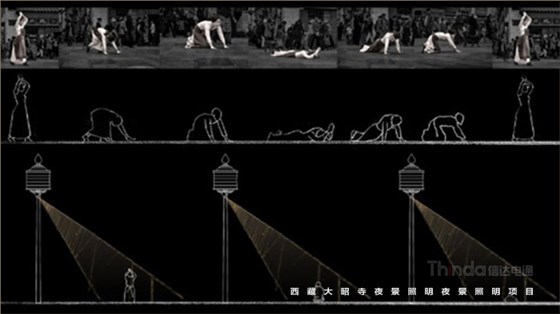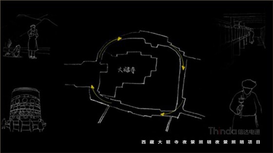 3)重大節(jié)日模式下所有照明燈具全開,重要節(jié)點投影經(jīng)文開啟,使大昭寺成為一個巨大的轉(zhuǎn)經(jīng)筒與朝拜的人一起緩緩轉(zhuǎn)動。
