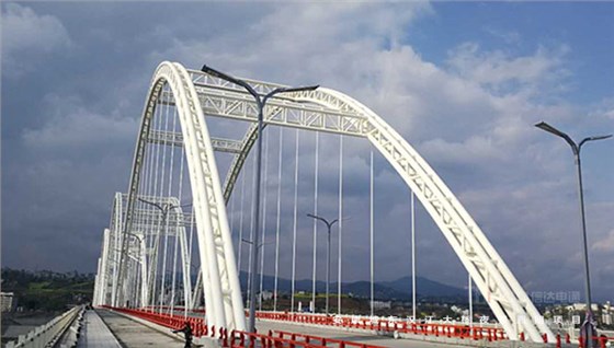 安康市城東漢江大橋軸線呈南北走向,大橋為剛梁柔拱的七孔系桿拱橋,中間五孔設(shè)置拱肋。整體簡潔、大方、現(xiàn)代、美觀,橋梁主體為乳白色,橋墩及梁腹顏色為亞灰色,大橋全長1907.21m,其中主橋長810.0m,南北引橋共長1097.21米,橋軸線與漢江基本正交,與江南巴山東路設(shè)分離式立交,與江北G316設(shè)環(huán)形平交(遠(yuǎn)期成菱形立交),本項目為獨立特大橋工程。