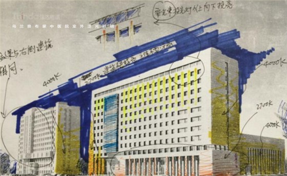 烏蘭察布蒙中醫院是由政府投資建設的以突出蒙中醫特色為重點的綜合性醫院,位于烏蘭察布市集寧新區工農大街西呼格吉街南,蒙中醫院的室外泛光照明一方面需要考慮其功能性,同時在其建筑類型和定位上也要有所不同。