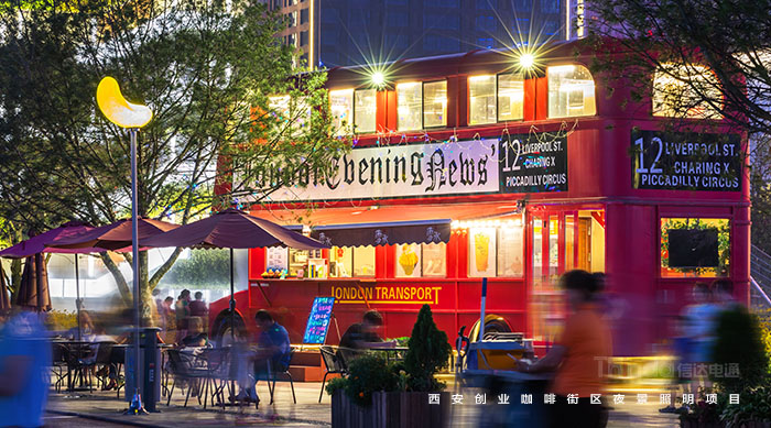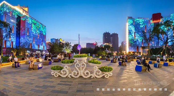 信達電通在2017年完成了眾多大型城市亮化項目,其中濃墨重彩的一筆當屬西安創(chuàng)業(yè)咖啡街區(qū)的亮化。
