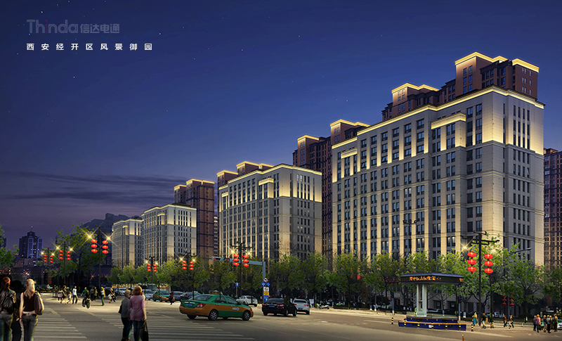 風景御園位于西安市經開區鳳城八路,在市政府對面,本項為商業辦公樓夜景照明設計,建筑的立面材質為淺色石材為主。四棟建筑的建筑形態相同,沿縱向結構游走,整體造型簡潔、大氣,本項屬于高層建筑。