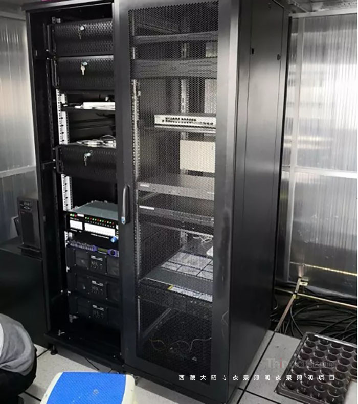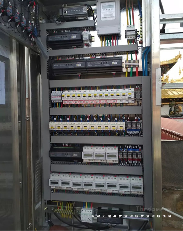 大昭寺的整體照明控制采用信達科技自主研發的鼎立慧聯智能控制系統??刂葡到y采用手動、時間經緯度、4G智能照明等控制方式,控制模式分為節能、平日、節日三種模式,總控制室設定在管委會樓頂景觀照明控制室。大昭寺四周所有投光燈具使用DALI調光控制系統,主控設備具有RS485擴展接口,同時系統可通過電腦圖形化界面對所有的燈光進行集中控制監視。