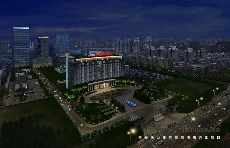 在陜西鼓動力的建筑景觀亮化改造中北京信達(dá)電通通過照明的亮度和顏色突出陜鼓動力的建筑輪廓,燈具造型和燈光顏色與陜鼓的商業(yè)用途和建筑外觀相結(jié)合,進(jìn)而加強(qiáng)陜鼓的渲染力。